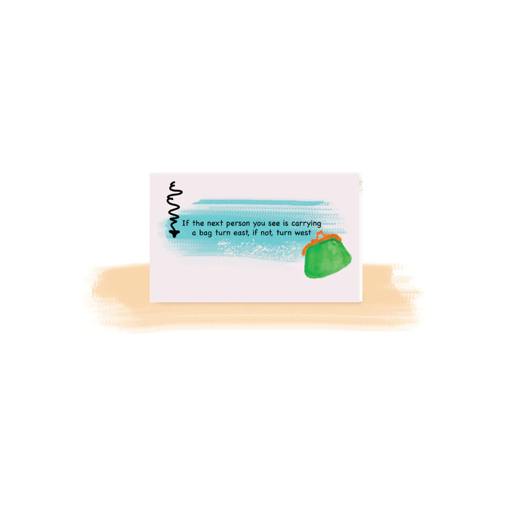 Grab your pack and head out on your walk. Your path will be decided by the birds, your shoe size, animals you pass, the weather, what other walkers are holding, letterboxes and street signs you pass and some other crazy directions along the way. The new directions rely on elements that change every time you are walking which means that even if you set out from the same spot on your walk you’ll have a different walk each time.