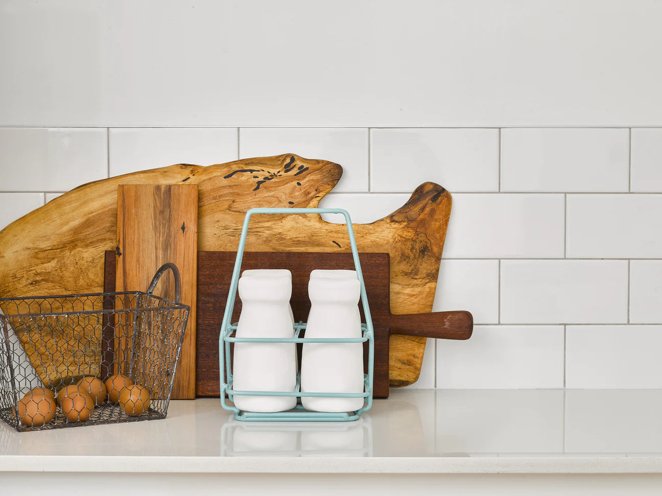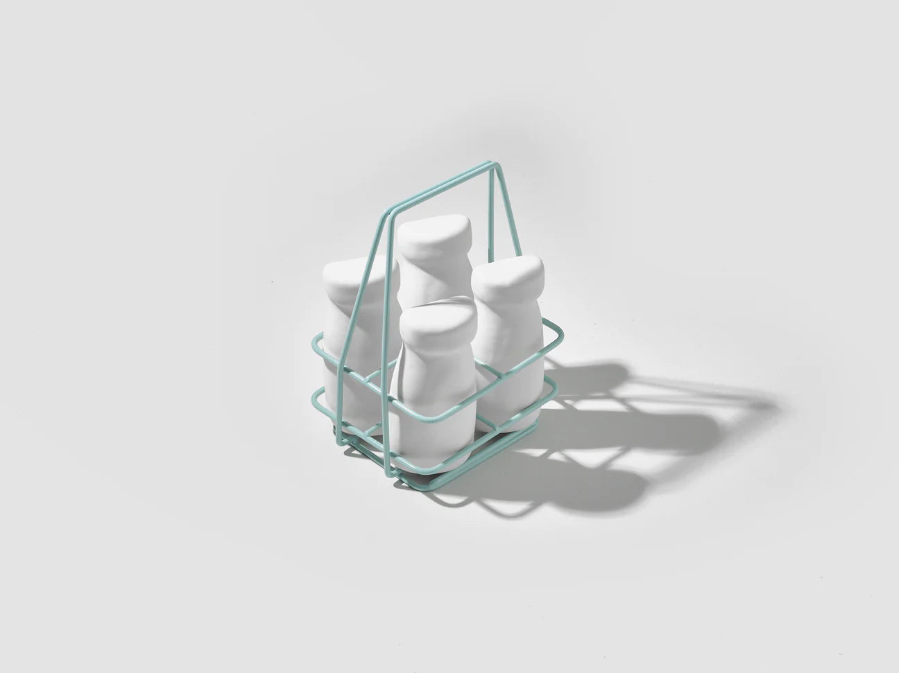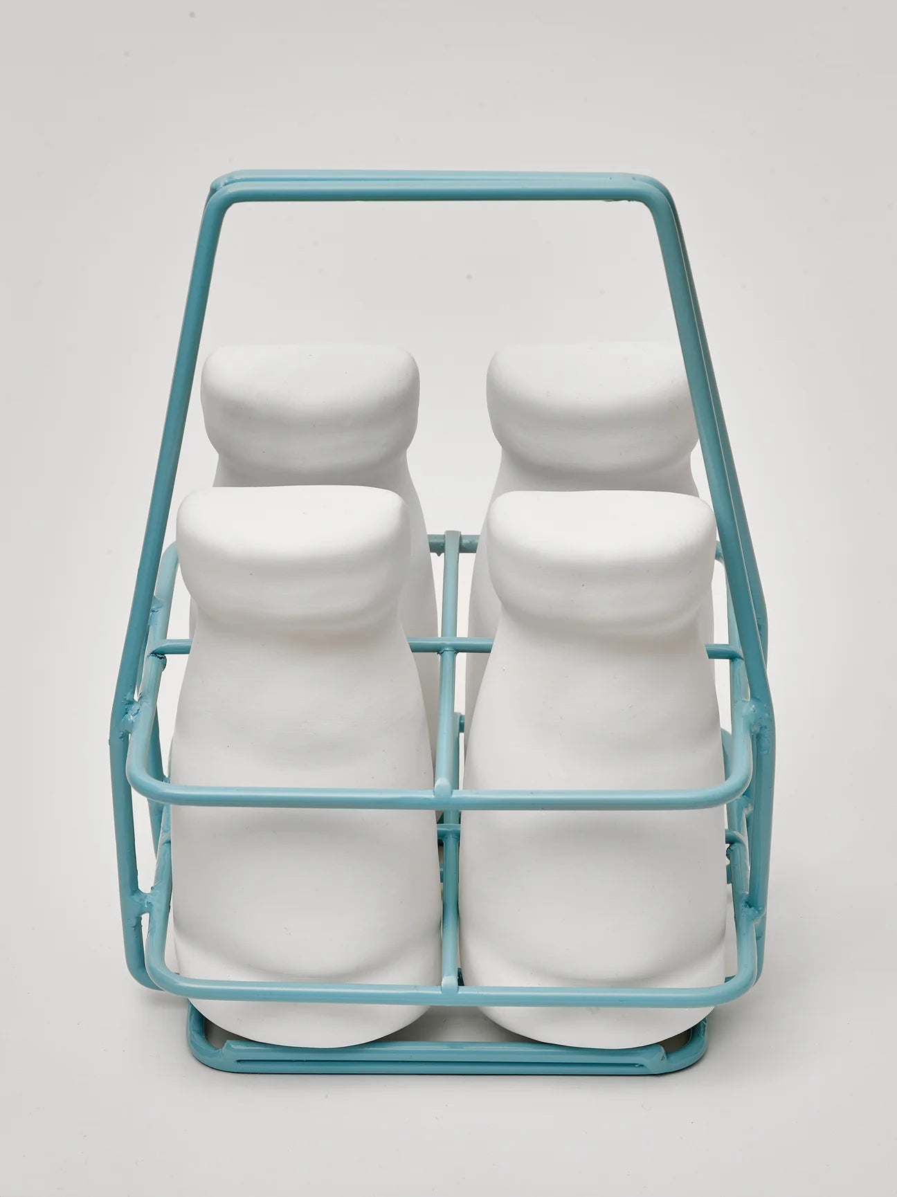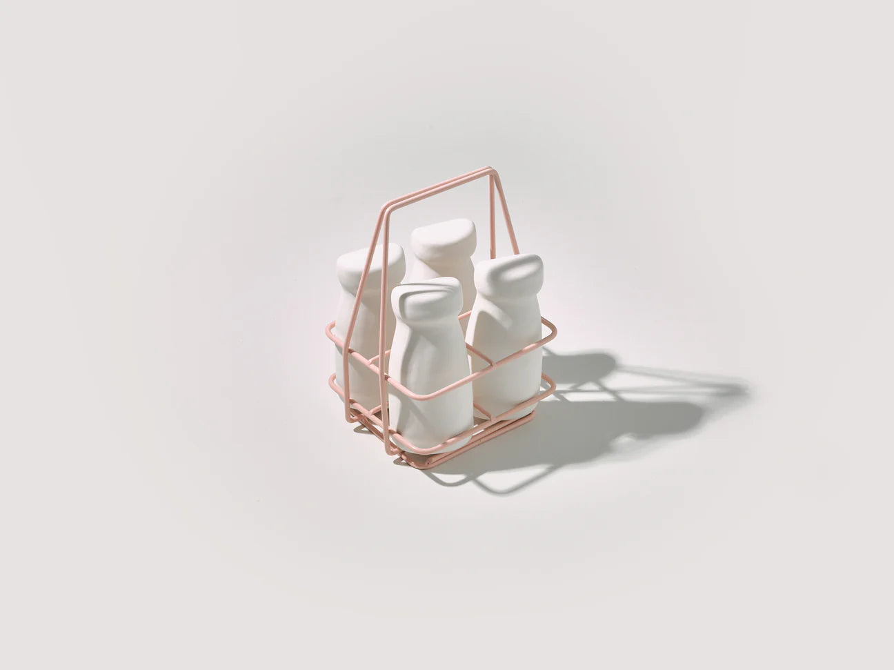 Fresh delivery! The milk crate features four slipcast porcelain jumbo milk bottle lollies in a baby pink crate. Powder coated wire crate created in collaboration with ICO traders, a design company based in the South Island. All elements of this piece are handmade in NZ.