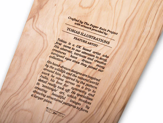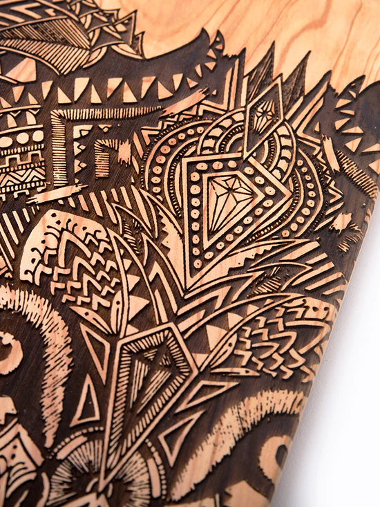 'Wolf' design by Tobias Illustrations laser etched onto a macrocarpa art board crafted in-house at The Paper Rain Project.